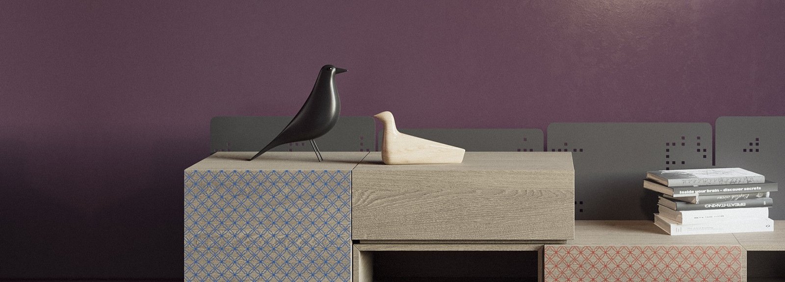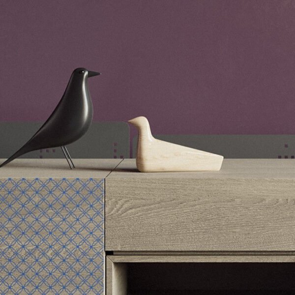 Sideboards with wooden movable parts, decorative elements and a metal base.