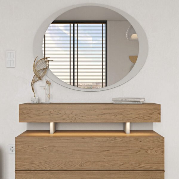 Στην όμορφη εσοχή που δημιουργείται, τα τοποθετημένα led φωτιστικά και το usb φόρτισης είναι σχεδόν αόρατα! Ο καθρέπτης της συλλογής με το διαφορετικό και εξεζητημένο οβάλ σχήμα προσθέτει τη δική του μοναδική πινελιά!