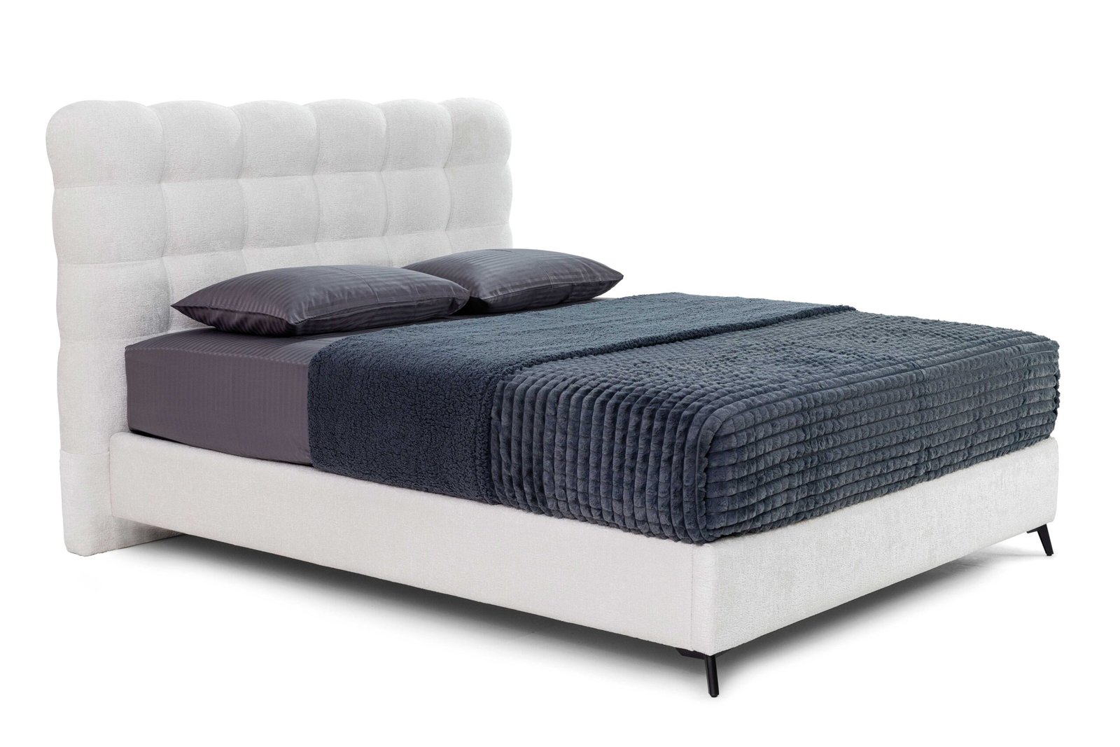 A bed with a distinctive, playful texture. The richly quilted headboard in a “bubbles” pattern creates a unique sense of softness and originality.