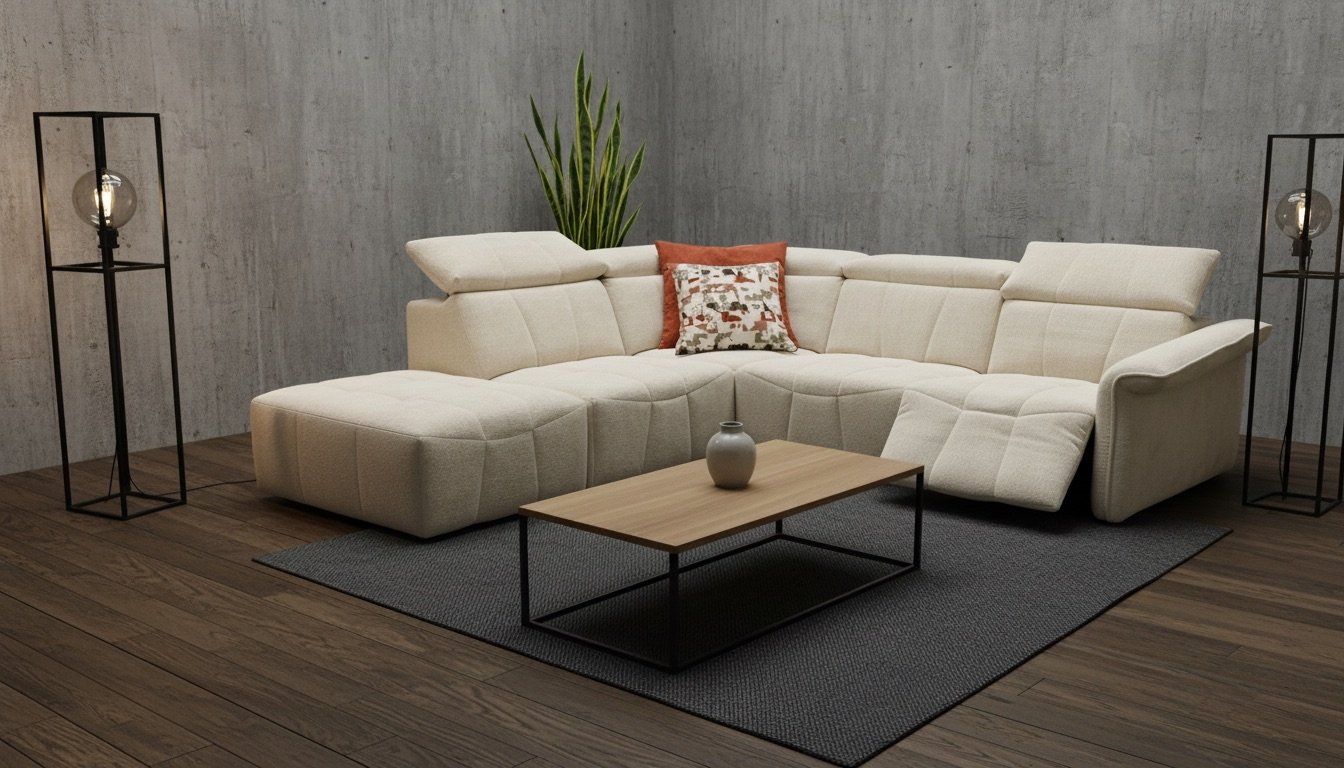 Το εντυπωσιακό στυλ συναντά την απαράμιλλή άνεση στην χειροποίητη γωνιά FLOW με τα ηλεκτρικά ανακλινόμενα καθίσματα.